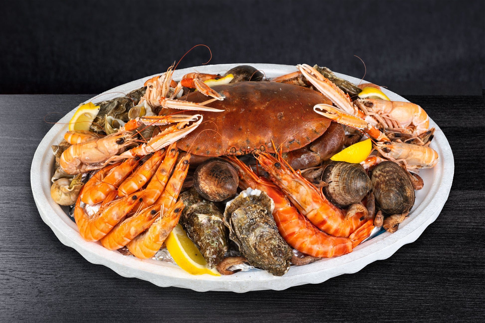 Originie / mode de pêche: Crevettes 20/30 (Equateur / Elevage), Crevettes 40/60 (Equateur / Elevage), crevettes grises (FAO27 / Chalut), Bulots (FAO 27 / Pêche en casier), Pinces de crabe (FAO 27), Amandes (FAO 27), Huîtres n°3 (France / Elevage)